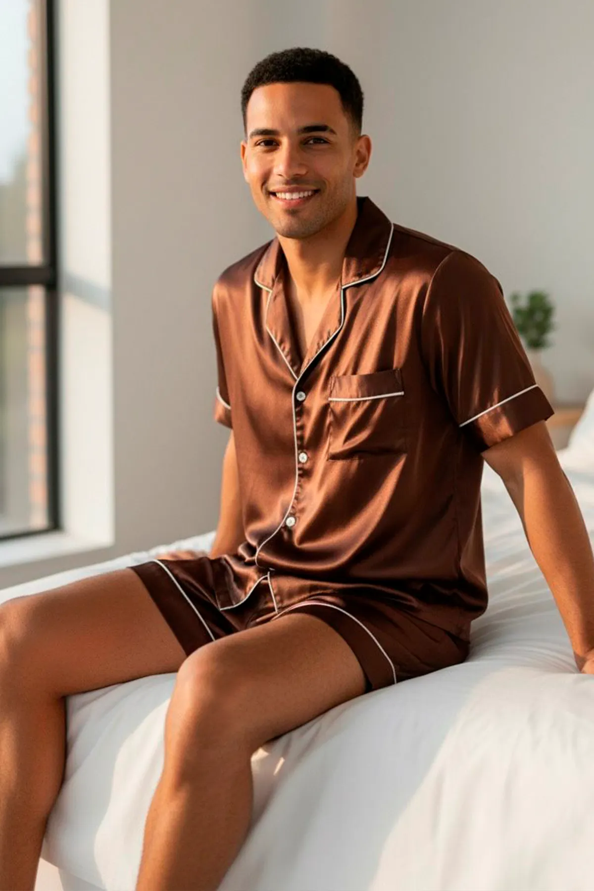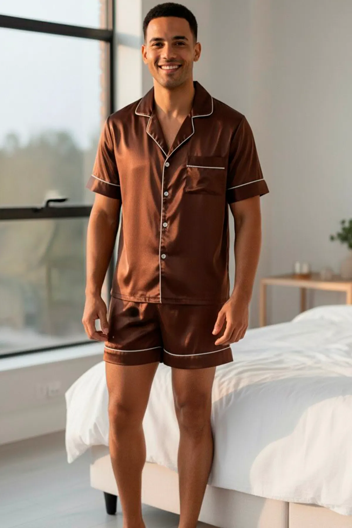 Pijama Americano Masculino em Cetim de Seda Premium – Moss Brown