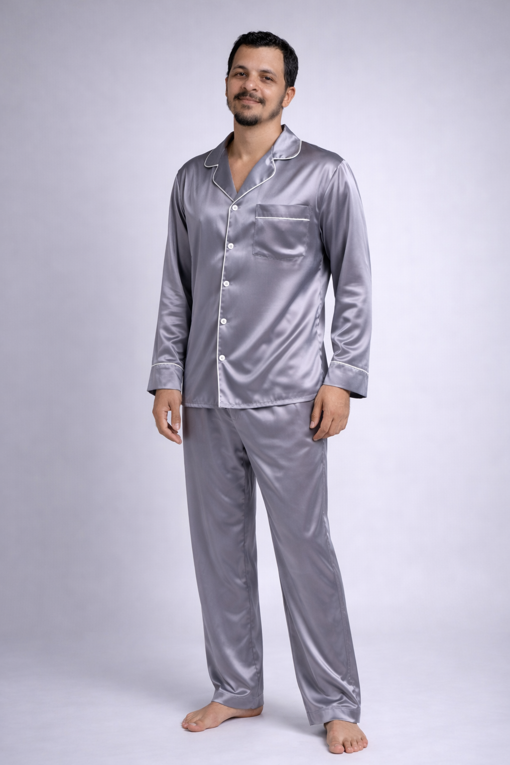 Pijama Americano Masculino em Cetim de Seda Premium – Prata
